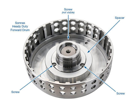 The SON-34554-11K is the Sonnax billet aluminum clutch volume spacer kit for the heavy-duty forward drum 34554-01. The SON-34554-01 provides a heavy duty / lightweight design that is the perfect upgrade for GM TH400 high performance applications.  Significant weight was removed behind the forward piston, leaving a larger fluid apply volume. This larger fluid apply volume does not significantly affect clutch apply and release times, but some sensitive applications may benefit from reduced volume achieved by installing a SON-34554-11K, Sonnax clutch volume spacer kit.  The SON-34554-11K is a good choice for "clean neutral" application.
